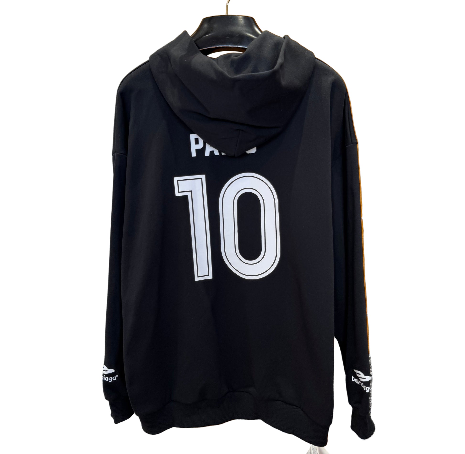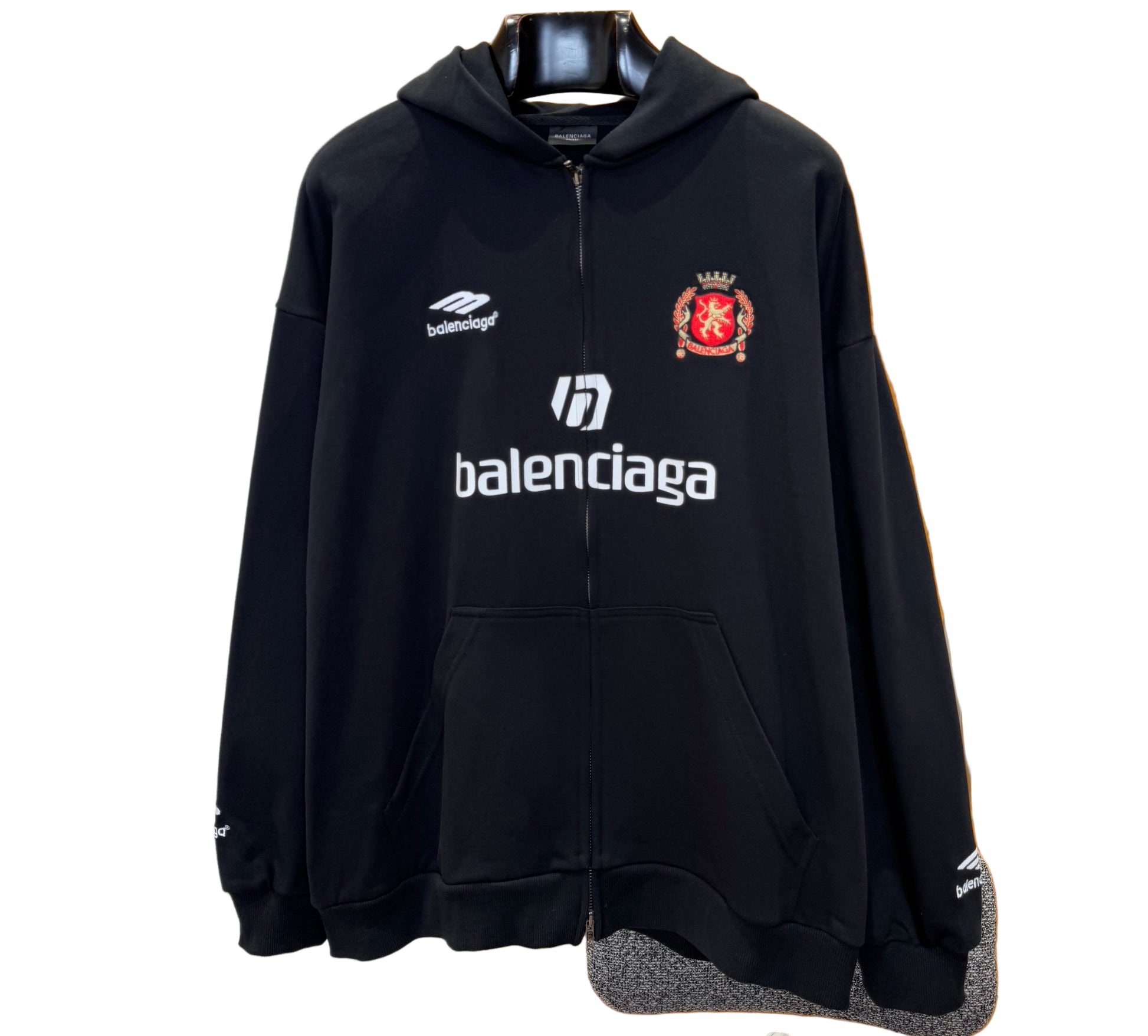 This Balenciaga black zip-up hoodie blends luxury streetwear with a sporty twist. Featuring the bold Balenciaga wordmark across the chest, flanked by a crest patch and contrast logo details, the design gives nods to both heritage and contemporary style. A full-length zipper and spacious kangaroo pocket provide everyday functionality, while the heavyweight cotton build delivers structure and comfort. Perfect for layering, this hoodie embodies the mix of casual ease and high-end presence that defines Balenciaga.