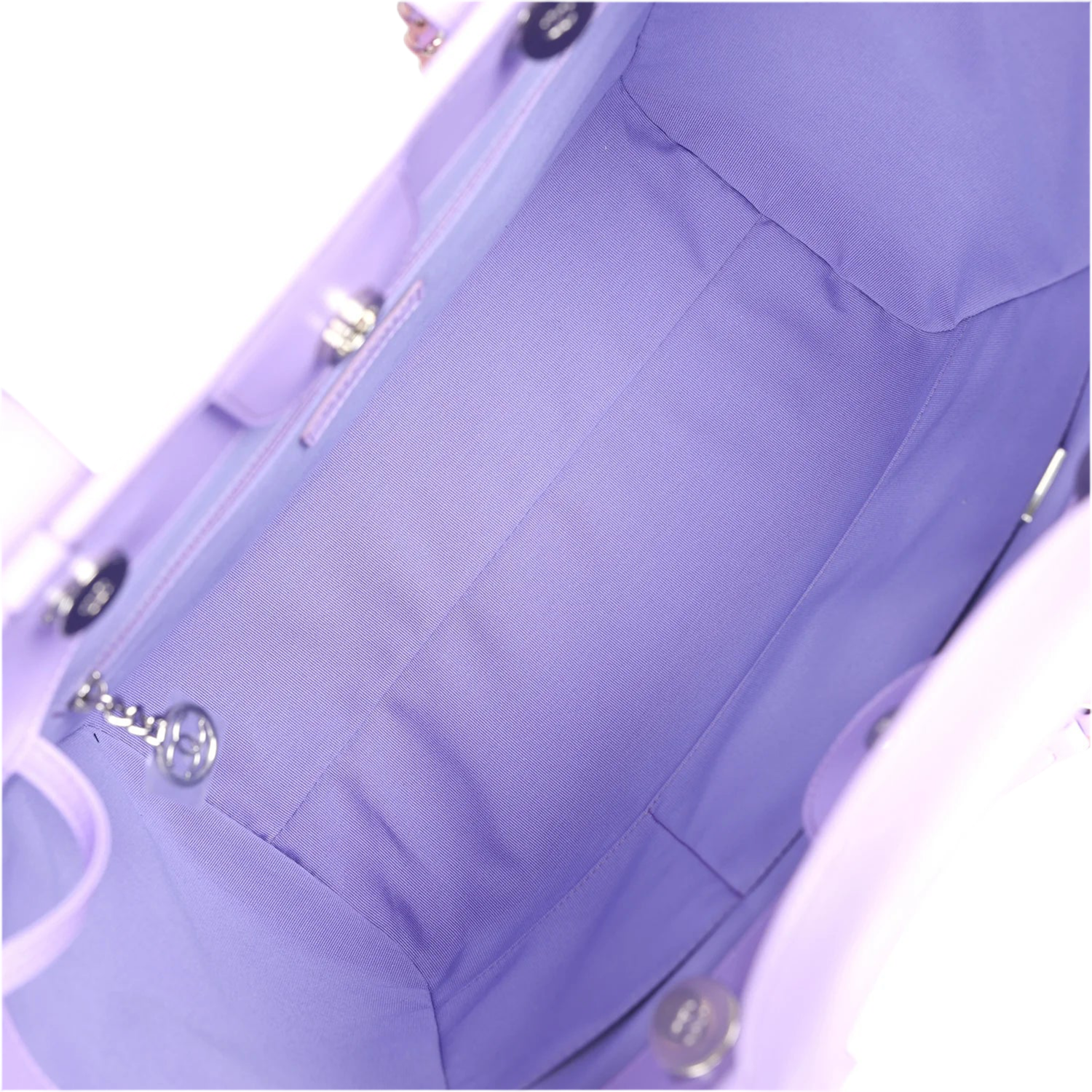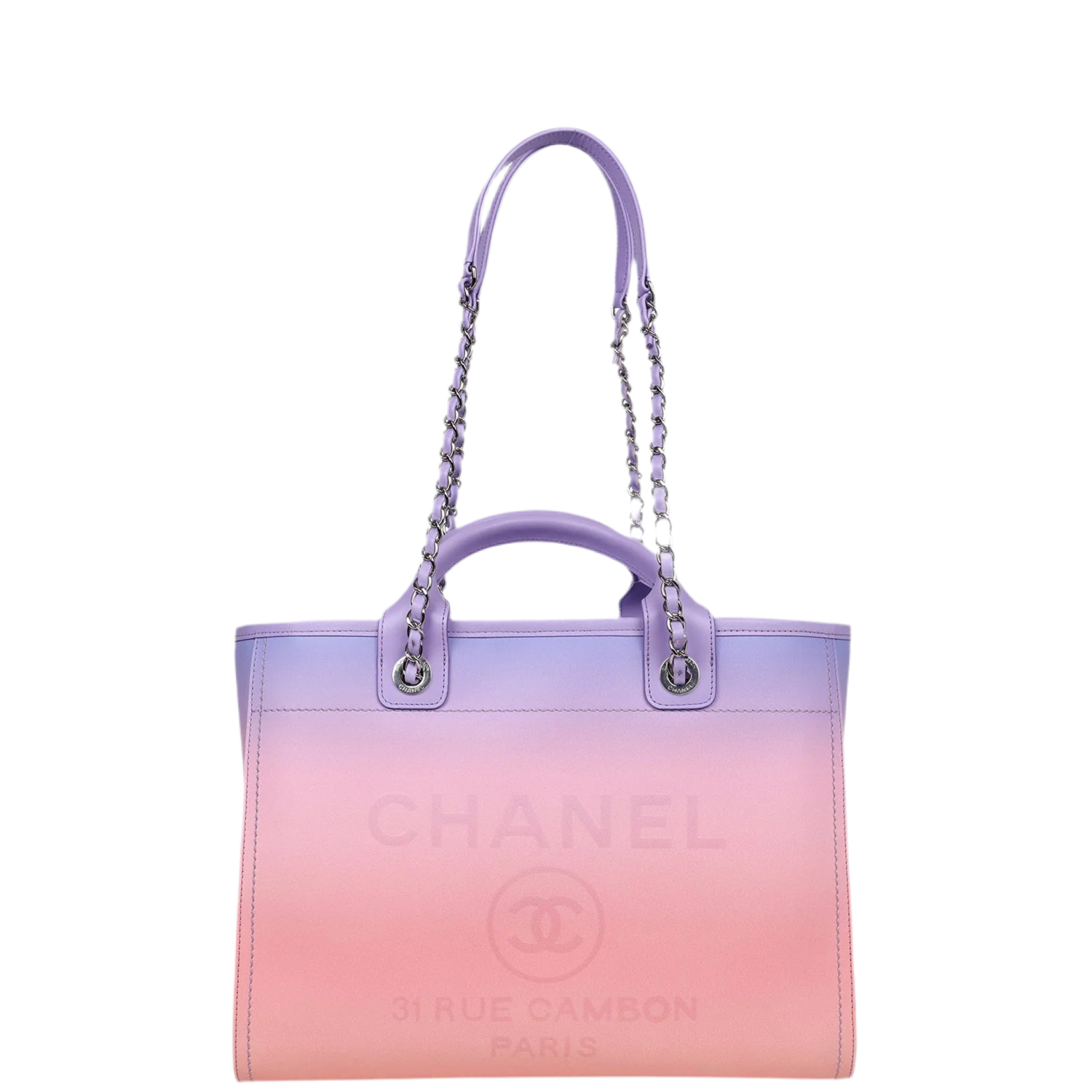 The Chanel Small Deauville Tote is a collector’s favorite that fuses bold design with everyday practicality. This edition stands out with its gradient colorway—soft coral pink blending into lilac purple—finished with silver-tone chain straps and an embossed Chanel logo detail.