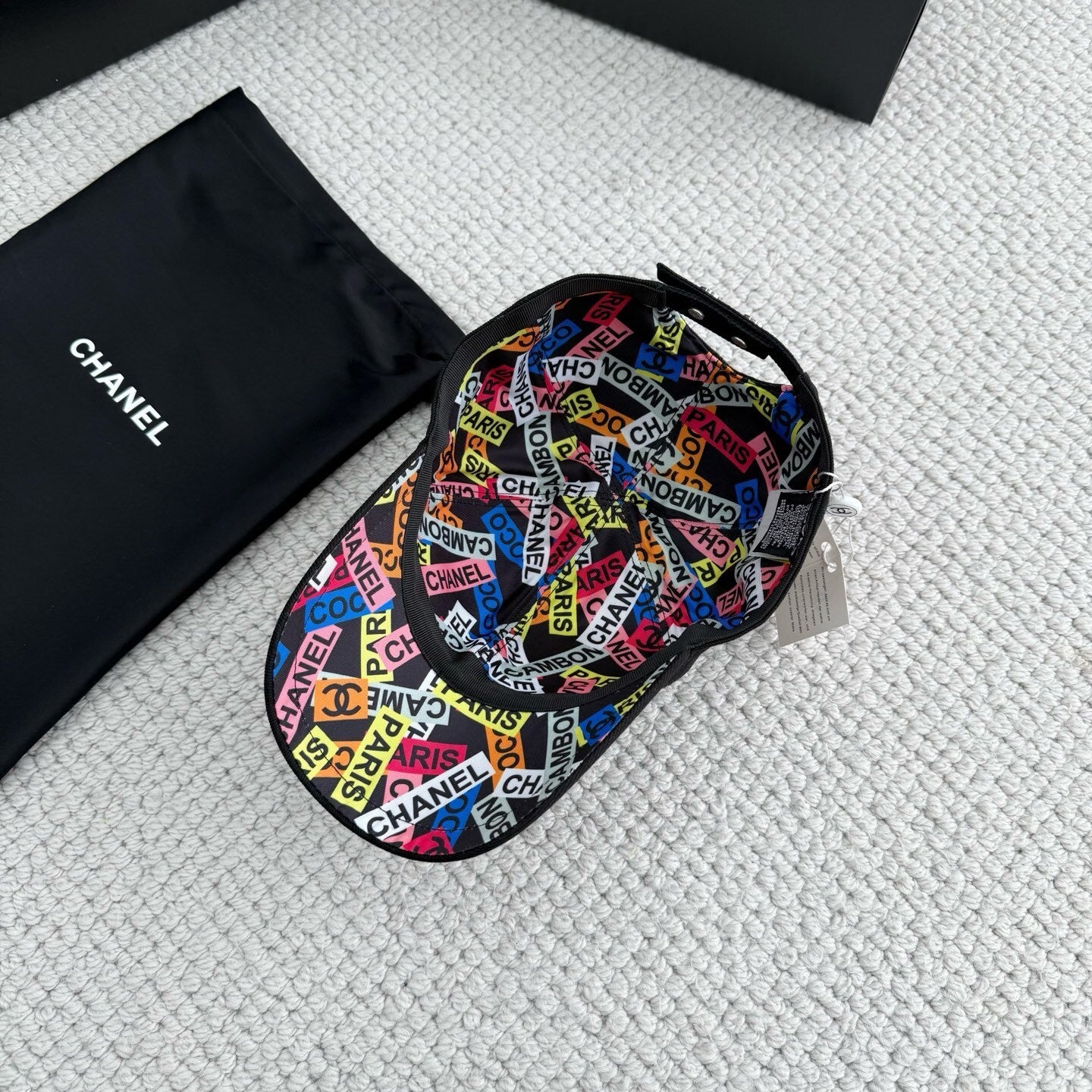 - Reversible build: Black with raised CC embroidery ↔ Multicolor all-over Chanel logos