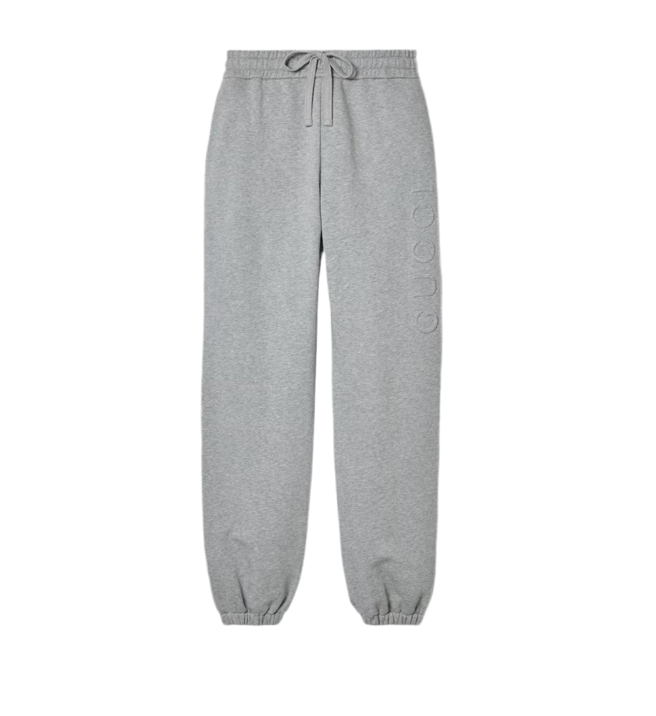 Crafted in Italy from soft cotton jersey, these Gucci sweatpants embody relaxed luxury. Designed in a versatile heather gray, they feature an elastic waistband with drawstring, ribbed cuffs, and the subtle tonal GUCCI logo detail along the leg.