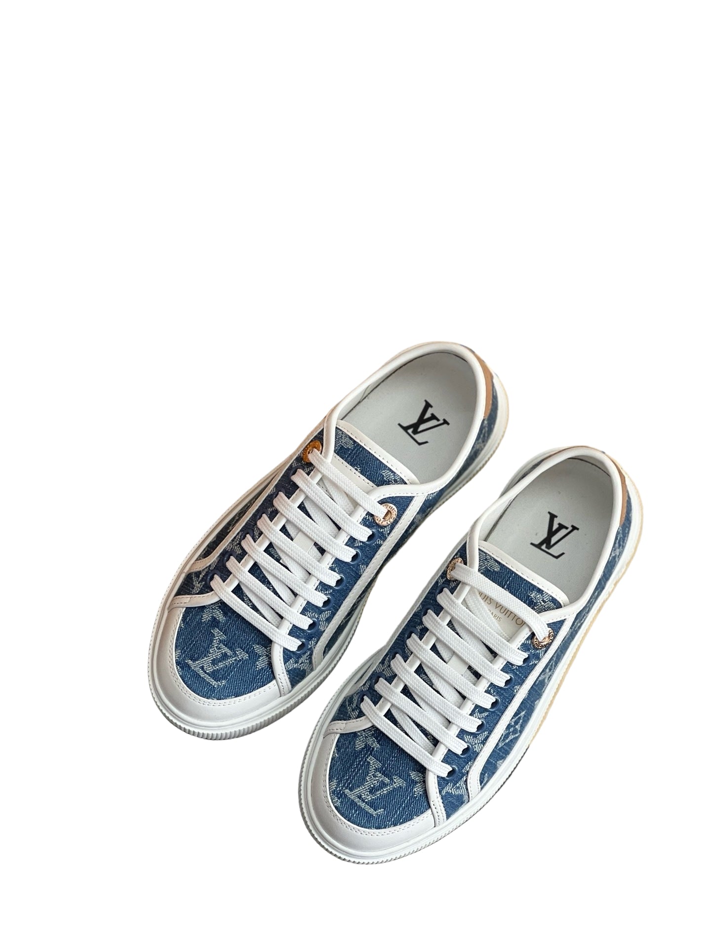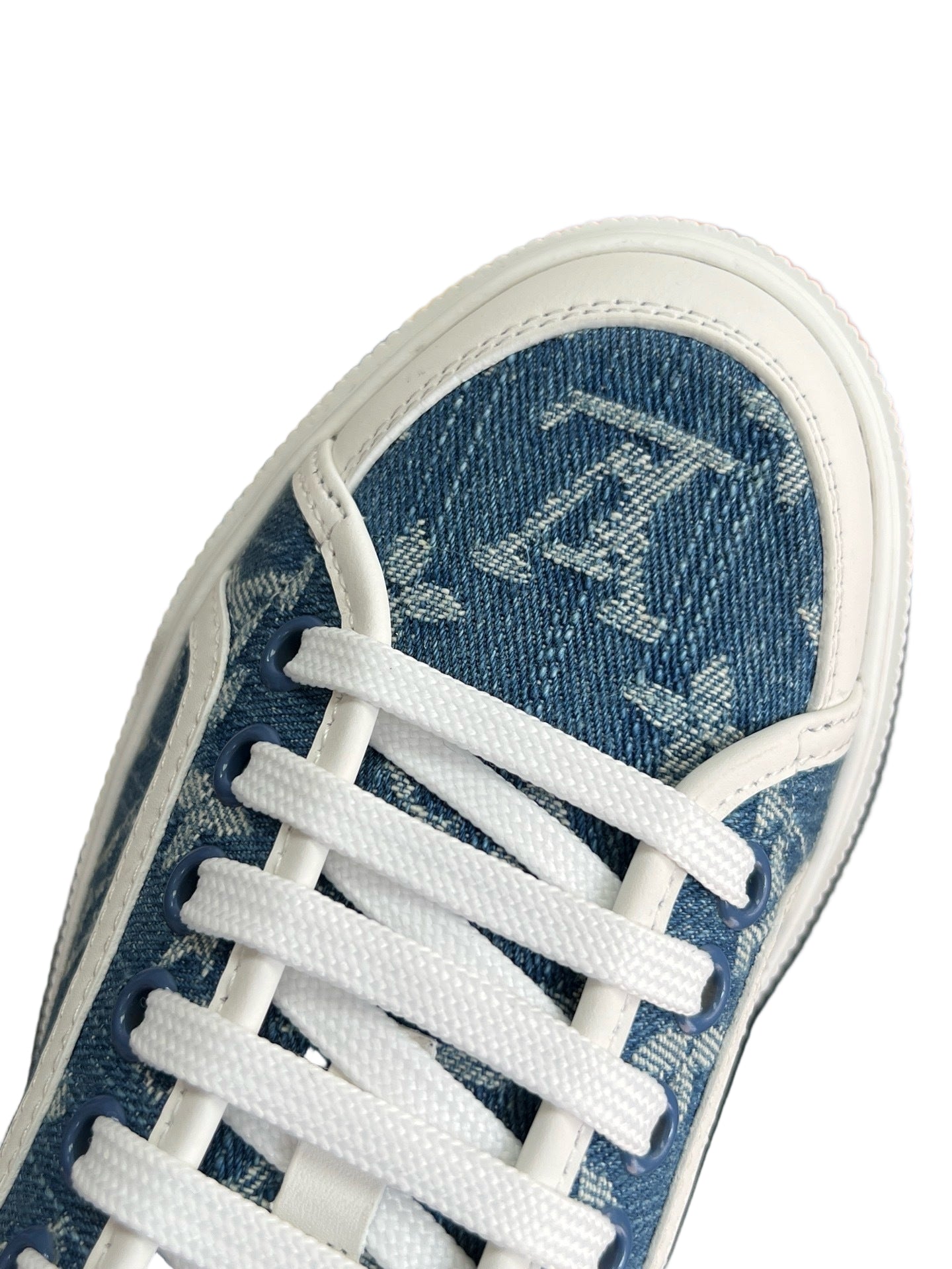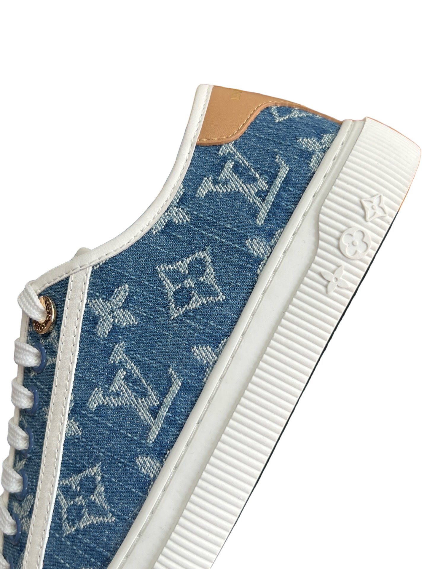 The Louis Vuitton Lagoon Sneaker reworks a classic low-top silhouette with Monogram denim in a rich blue finish. Set on a clean white rubber outsole, the design blends casual wearability with elevated detail, including polished eyelets and LV branding.