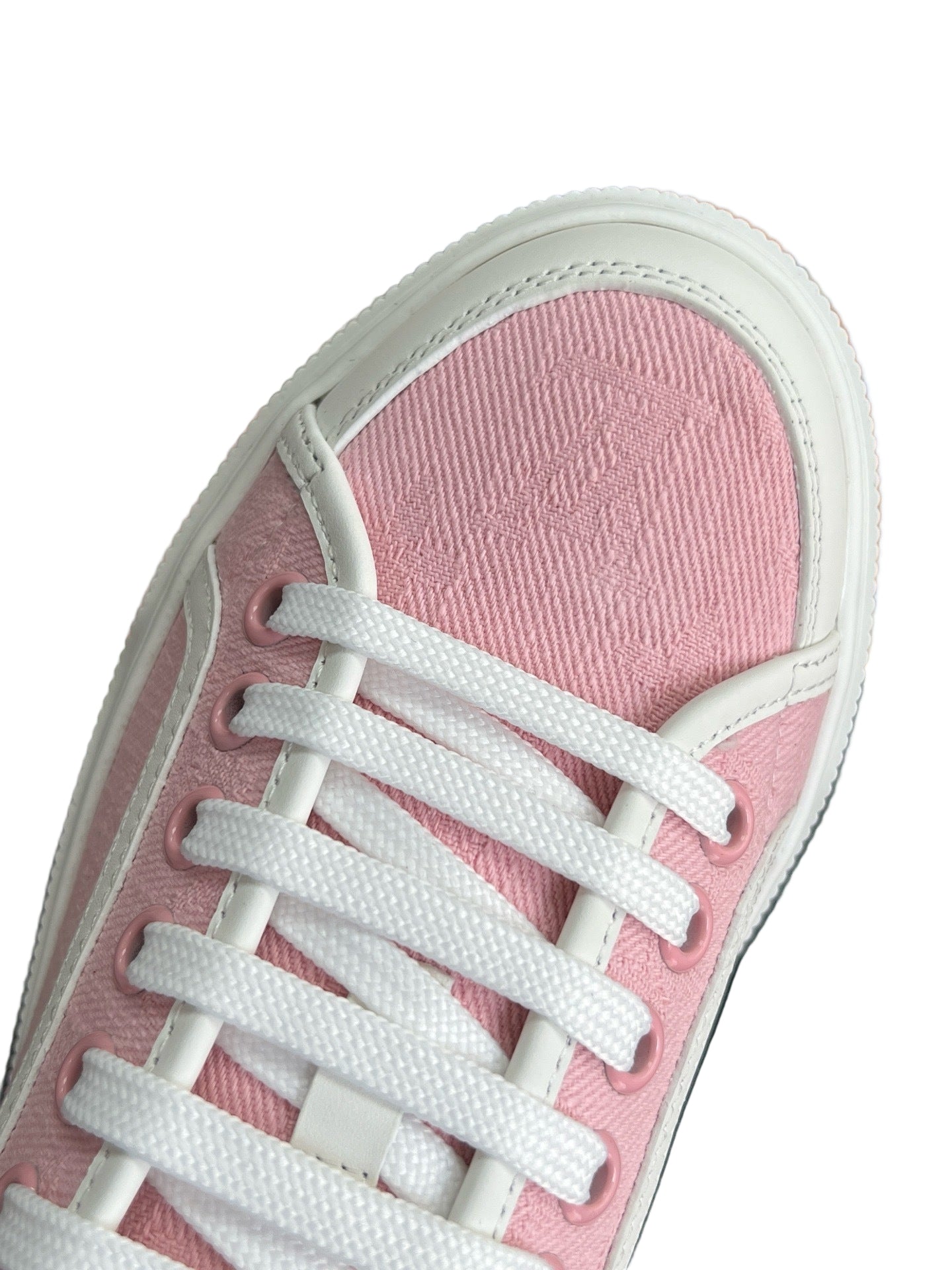 The Louis Vuitton Lagoon Sneaker elevates a timeless low-top profile with Monogram denim in a soft pink finish. Resting on a crisp white rubber outsole, the design merges casual wear with refined detail, including polished eyelets and LV branding.