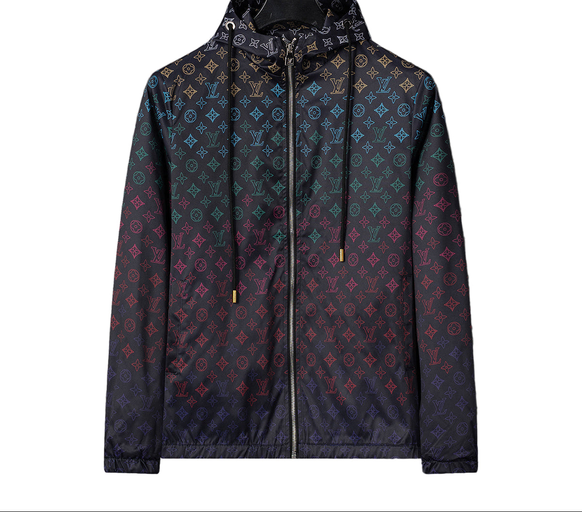 A standout from the new wave of luxury streetwear — this Louis Vuitton windbreaker reimagines the iconic monogram in a full-spectrum gradient across deep black nylon. Lightweight yet structured, it’s designed for movement, weather resistance, and pure visual impact. The subtle sheen of the fabric and tonal detailing at the cuffs, hood, and zip closure make it both functional and fashion-forward.