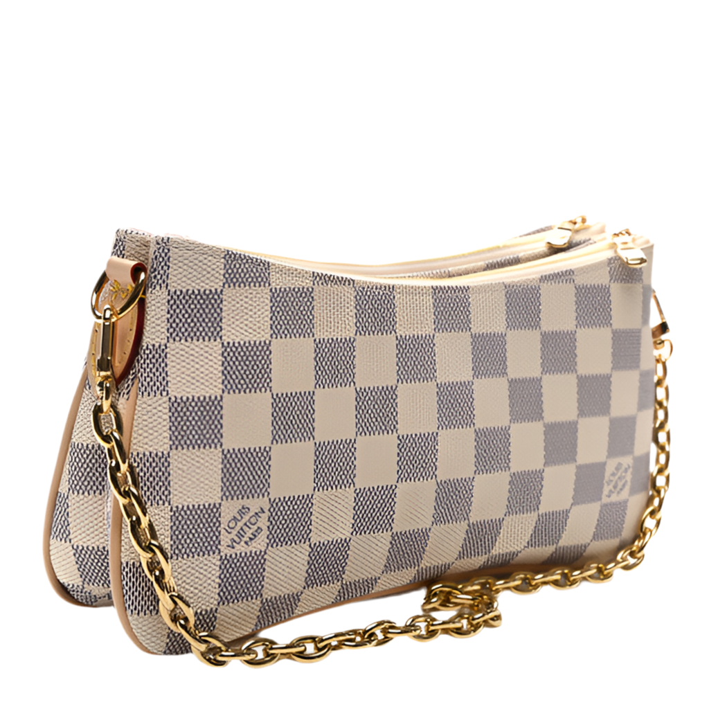 The Pochette Liv is a seasonal flex piece crafted in Louis Vuitton’s iconic Damier Azur canvas—designed for warm-weather styling and Riviera-inspired looks. Featuring a removable gold-tone chain and adjustable strap, it transitions effortlessly from shoulder to handheld wear. The double-zip closure opens to a central pocket, while the signature plaque highlights LV’s legacy of craftsmanship.