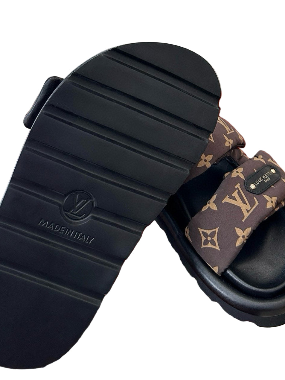 Designed with adjustable Velcro closures, lightweight soles, and signature hardware tags, it delivers both easy wear and elevated edge. A modern staple from Louis Vuitton’s poolside-ready collection, built for effortless flex.