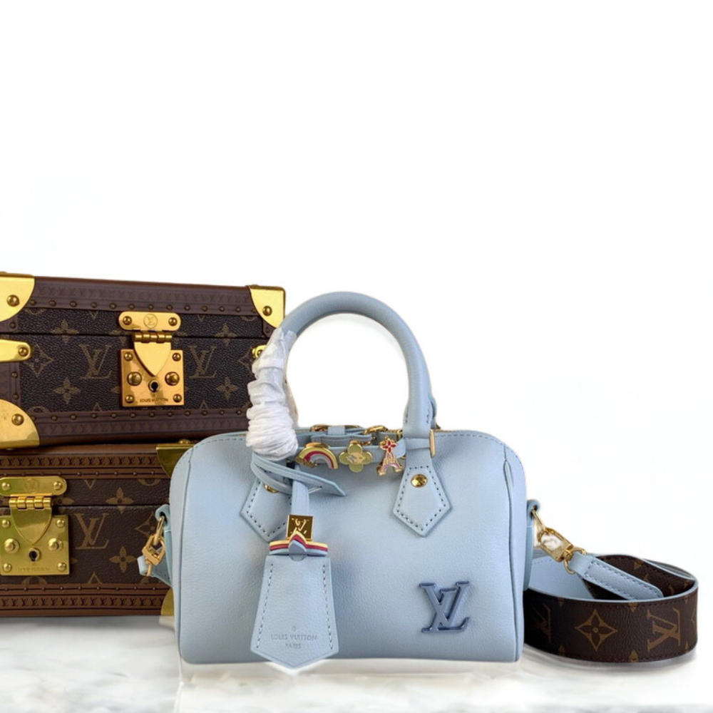 A compact re-imagining of the House’s historic travel icon, the Speedy Bandoulière 20 brings heritage design into the present. Crafted in Monogram canvas with [insert your color palette details — e.g., deep navy base with ivory trim], it features natural leather top handles and a detachable, adjustable strap for versatile carry.