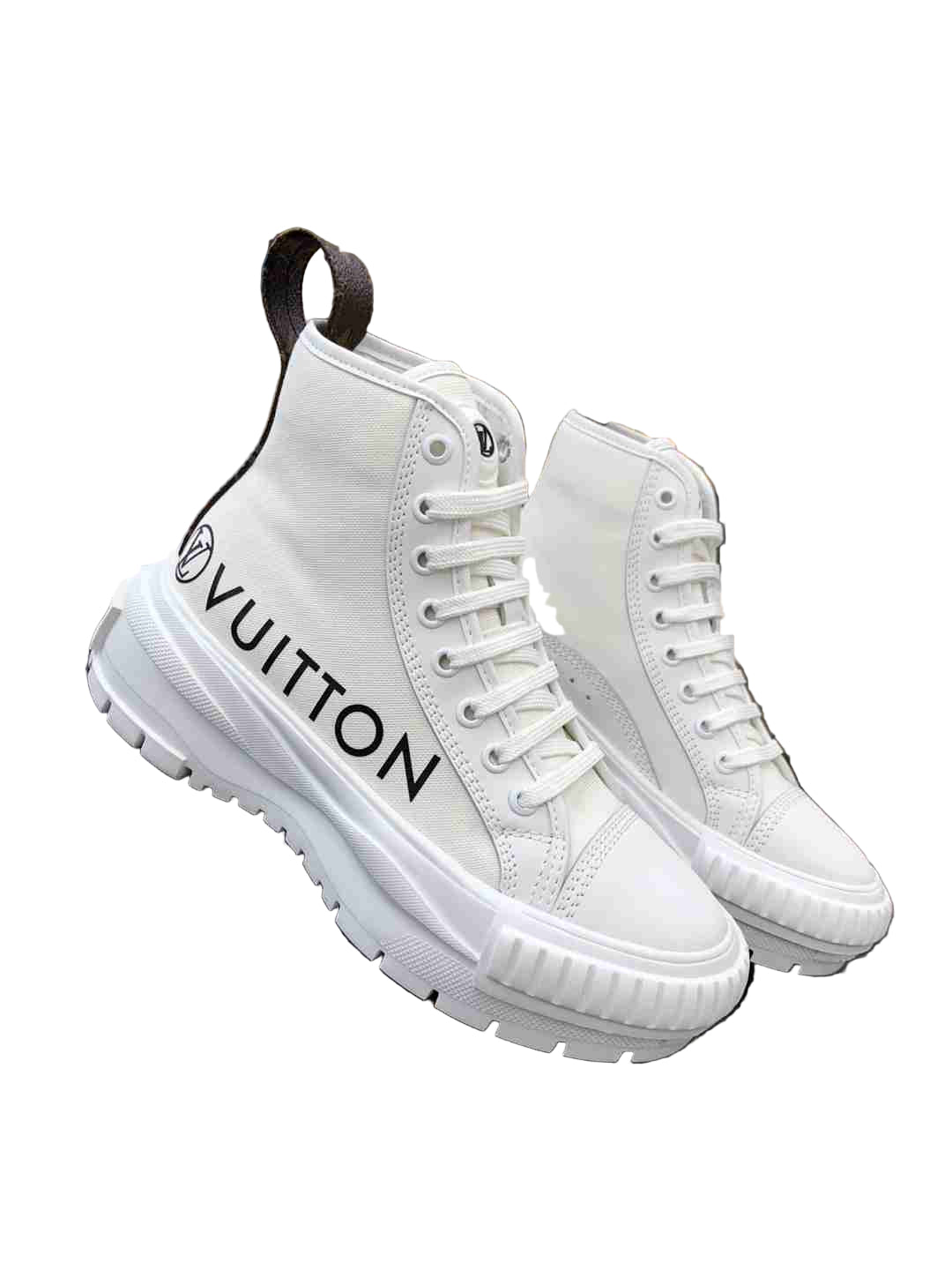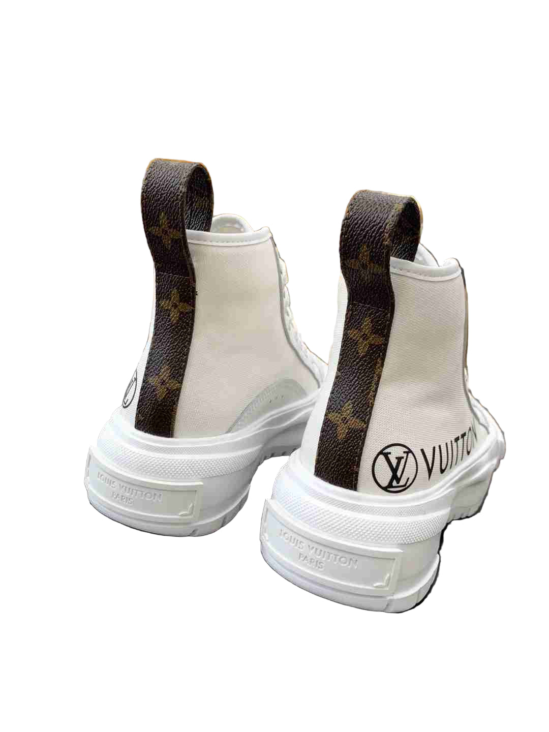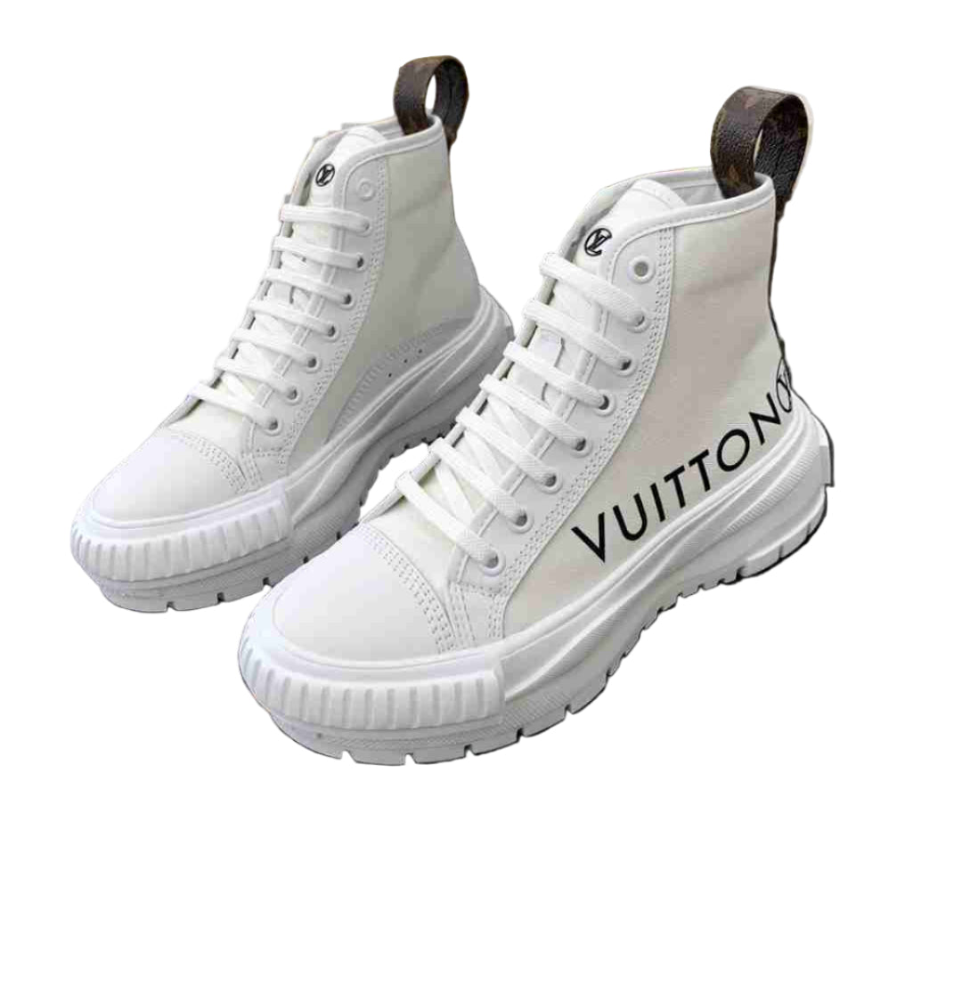 The Louis Vuitton Squad Sneaker Boot in White is a clean, elevated high-top built for movement and minimalism. Crafted from cotton canvas with calf-leather trim, this silhouette features tonal laces, a chunky TPU outsole, and signature LV Circle + Vuitton branding stamped on the side and tongue. Finished with a Monogram canvas heel loop and embossed outsole detailing, it’s a luxury flex for collectors, stylists, and anyone chasing crisp lines and premium finish.