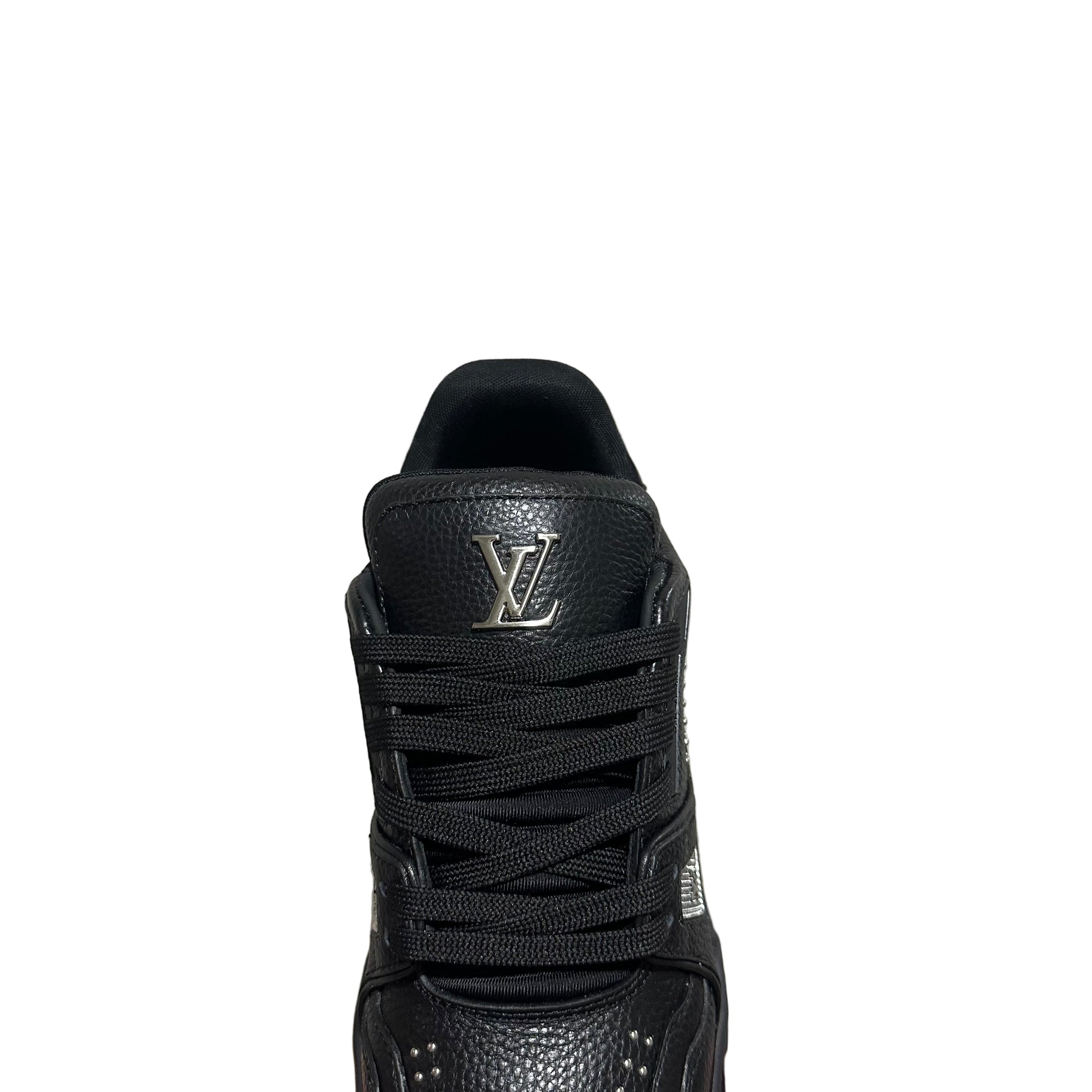 The Louis Vuitton Trainer Low takes on a stealth monochrome finish, crafted in supple black calf leather embossed with the iconic LV monogram. Inspired by vintage basketball silhouettes, the design features layered paneling, perforated details, and a tonal midsole engraved with Louis Vuitton. The mix of matte and polished textures elevates this sneaker from everyday wear to statement luxury, embodying Virgil Abloh’s vision of sport-inspired refinement.