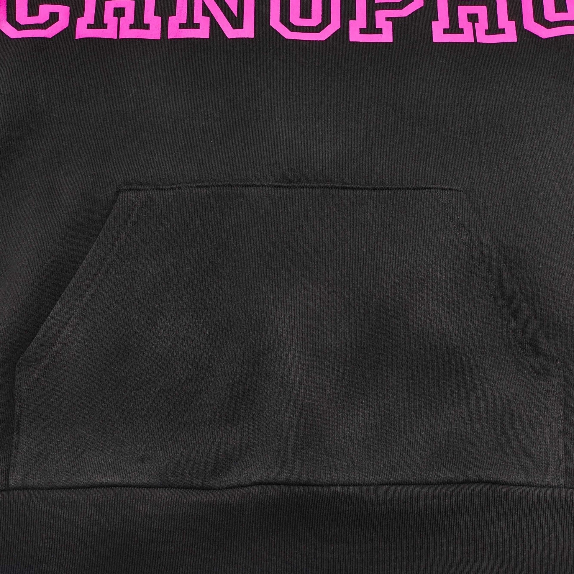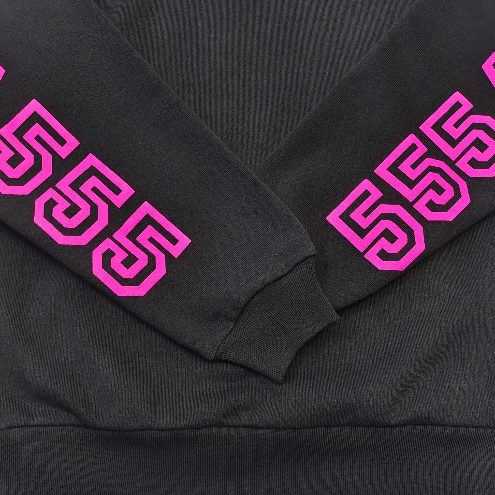 The Sp5der Pink Black Arachnophobia Hoodie fuses bold streetwear design with everyday comfort. Cut from an 80/20 cotton–poly blend, it features an oversized pink graphic across the chest and sleeve, a kangaroo pocket, and rib-knit cuffs and hem.