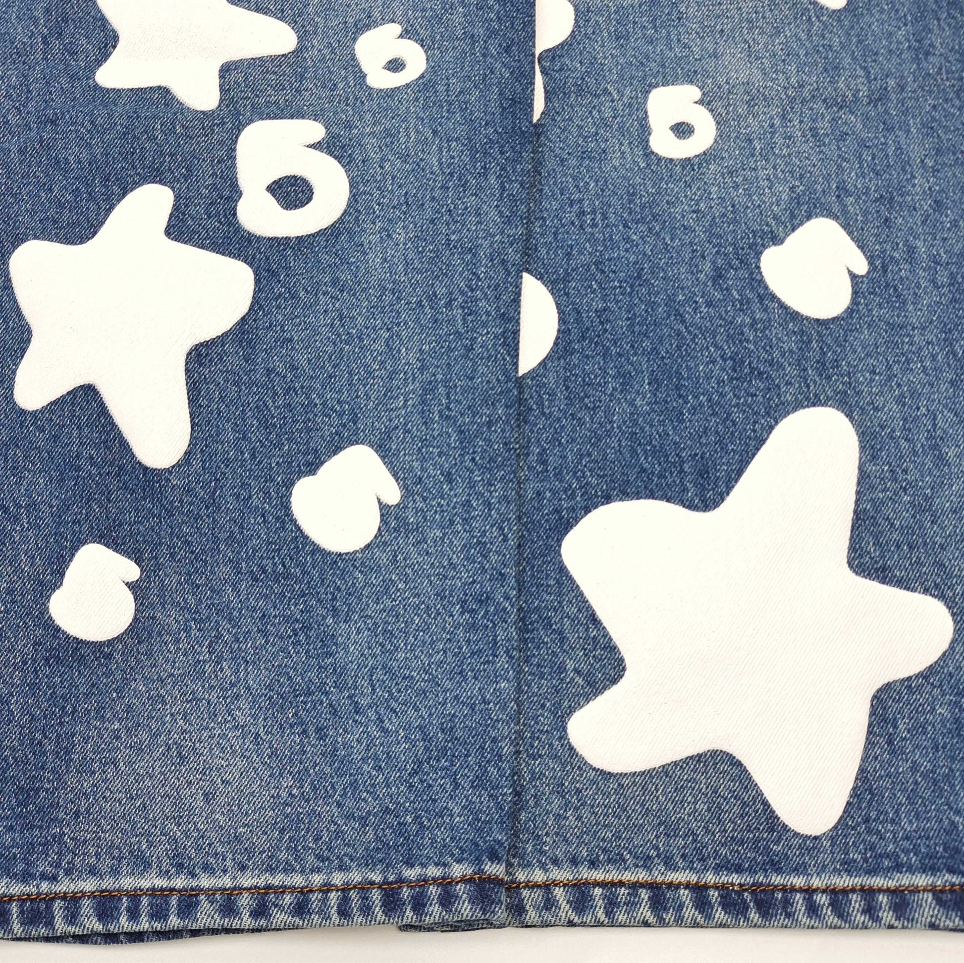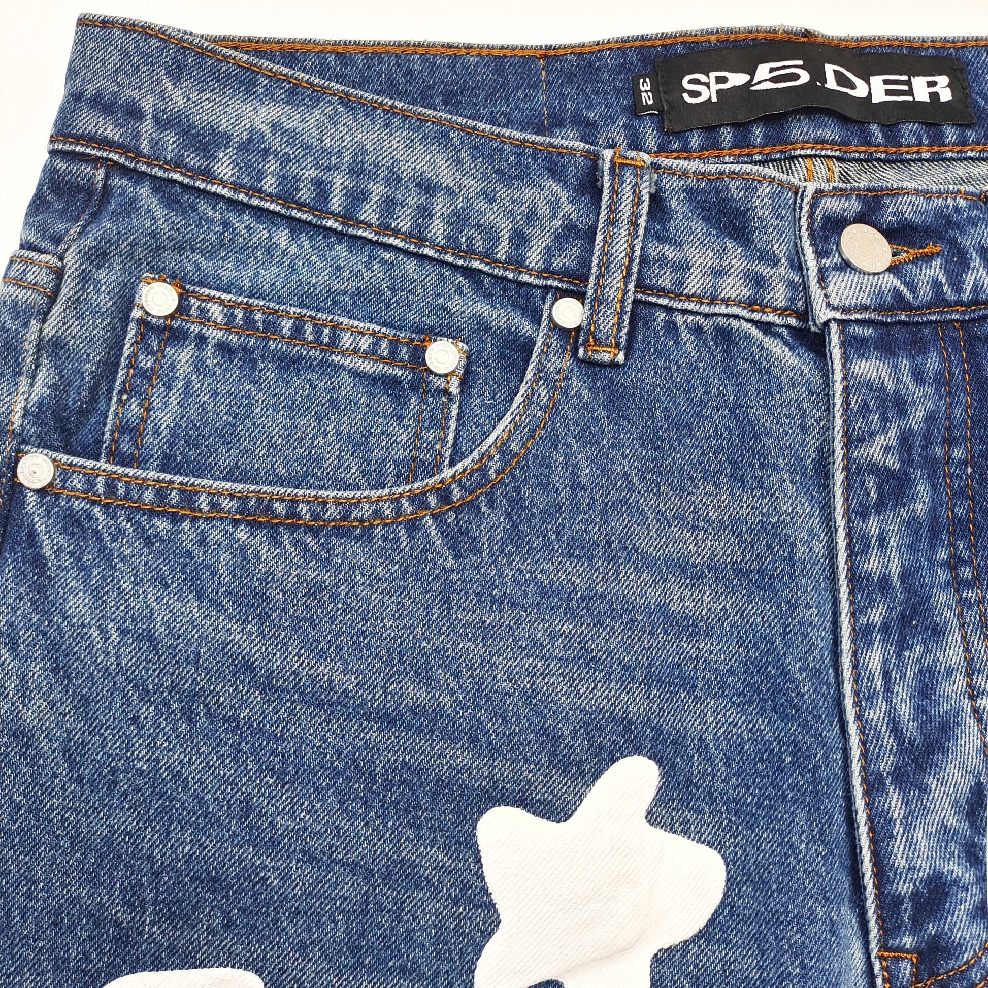 The Sp5der Beluga Wash Denim in Light Indigo Wash pairs playful graphics with a fresh seasonal finish. From the Spring/Summer 2025 collection, these jeans feature oversized white star and “555” prints scattered across a faded light indigo base.
