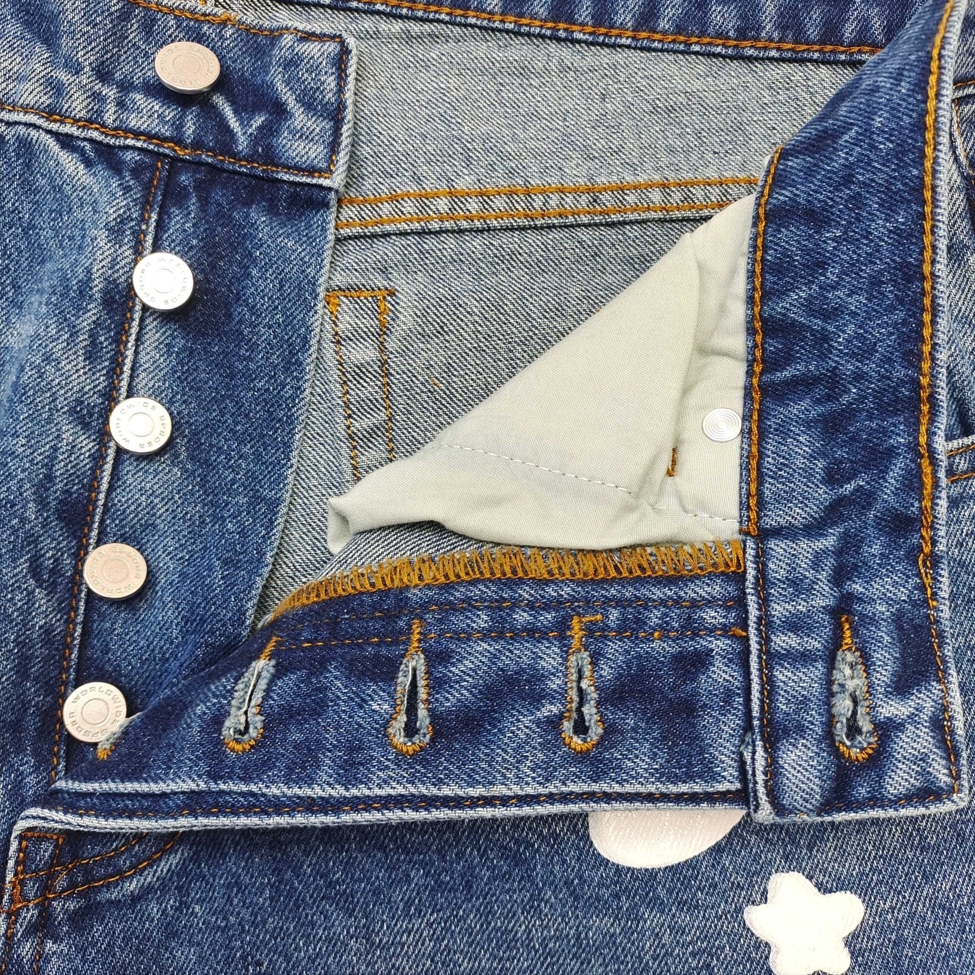 Clothing Features: Graphic print denim, Straight leg, 5-pocket styling, Button closure