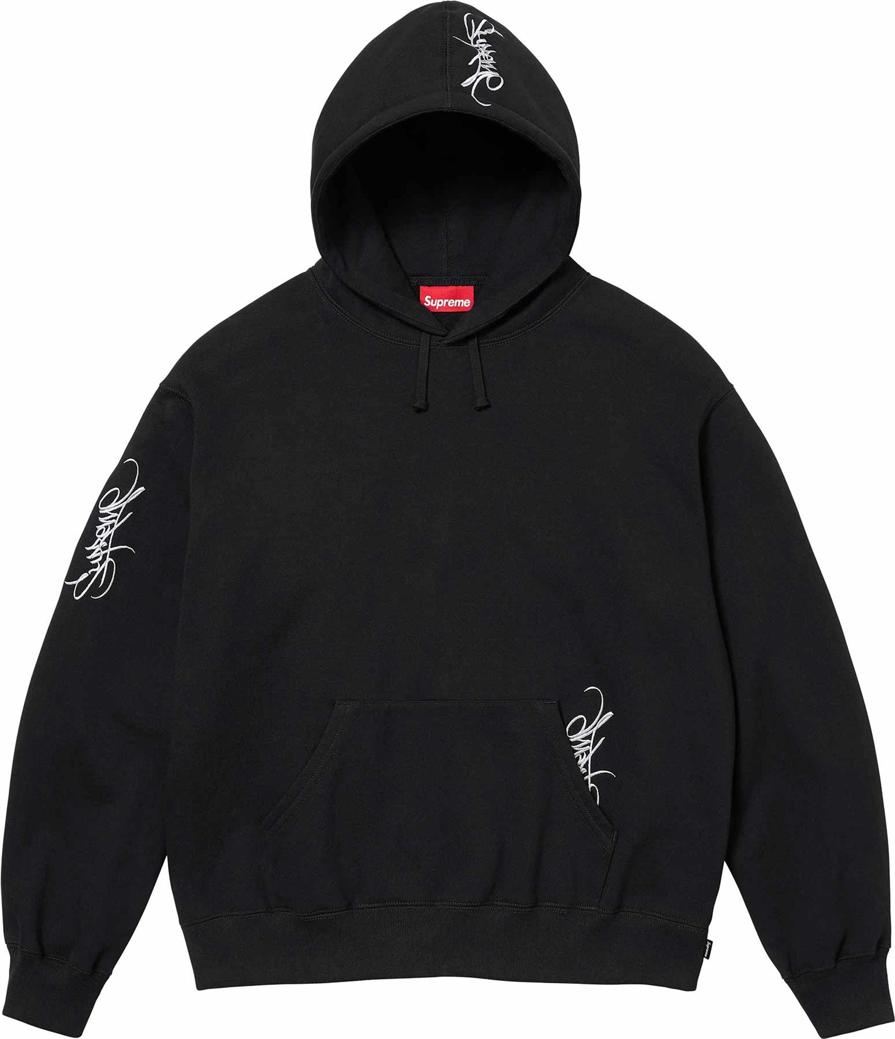 From Supreme’s SS24 collection, the Tag Hooded Sweatshirt puts a graffiti-inspired edge on a classic pullover. Crafted in heavyweight cotton fleece, the piece is softened with a brushed interior and cut with Supreme’s signature relaxed fit. White embroidered tag logos hit at the hood and kangaroo pocket, giving it a bold but understated detail against the all-black base. Ribbed cuffs and hem keep the silhouette structured, making it an easy staple for layering into streetwear rotations.