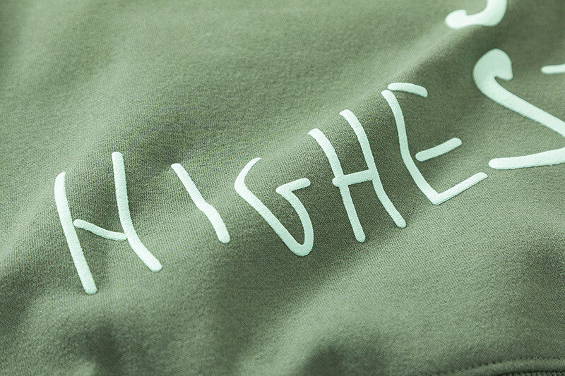 From the celebrated collaboration between Travis Scott and Jordan Brand, the “Highest” hoodie in olive green delivers a heavyweight streetwear staple with a bold graphic punch. The front features the inverted Nike Air logo, while the back is stamped with Travis Scott’s signature Cactus Jack branding, marking the piece as part of one of the most sought-after artist collabs in modern streetwear.