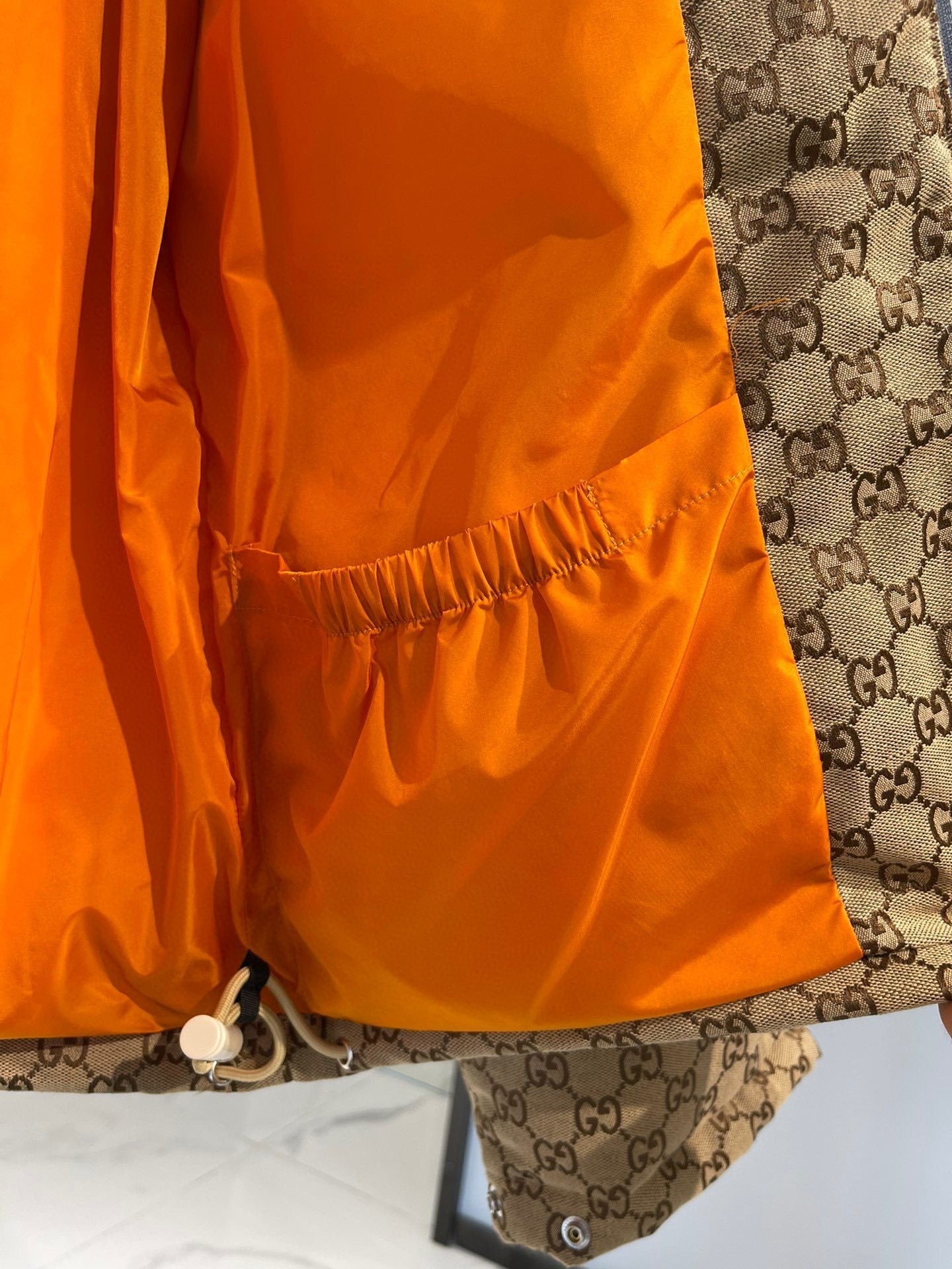 A rare icon from one of the most coveted collaborations in fashion, this Gucci x The North Face jacket merges luxury with performance wear. Rendered in Gucci’s signature beige and ebony GG monogram canvas, the silhouette takes on the classic North Face puffer structure with premium craftsmanship and distinctive detailing. The oversized fit, full front closure, and padded insulation make it as practical as it is collectible.